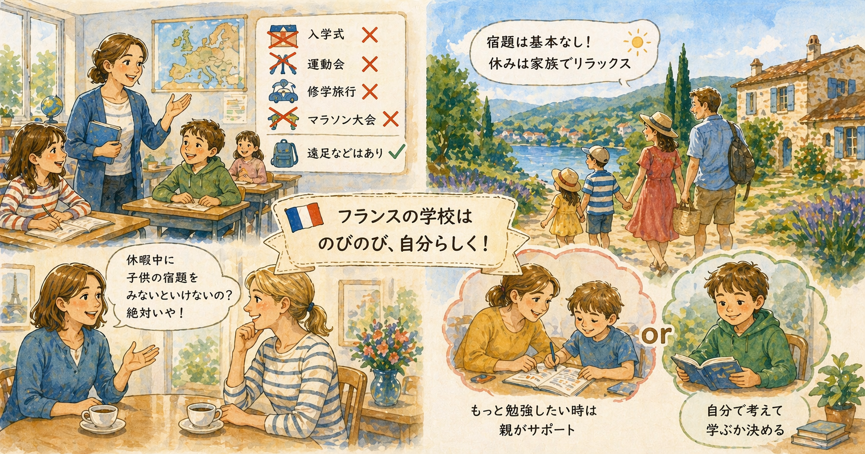 夏休みや冬休みも宿題はないのでフランスの子供たちは家族と田舎にバカンスに行き、自然の中でゆっくり過ごします。